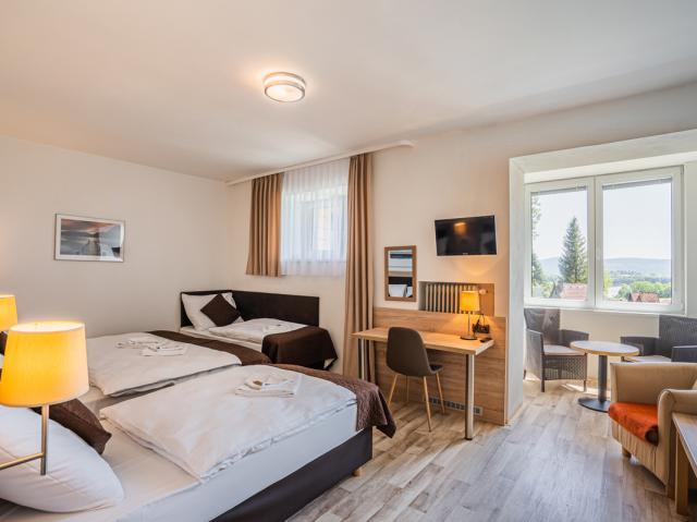#Standard 3: 18 m² - pokoj s manželskou postelí či 2 samostatnými lůžky a 1 samostatným lůžkem, sociální zařízení