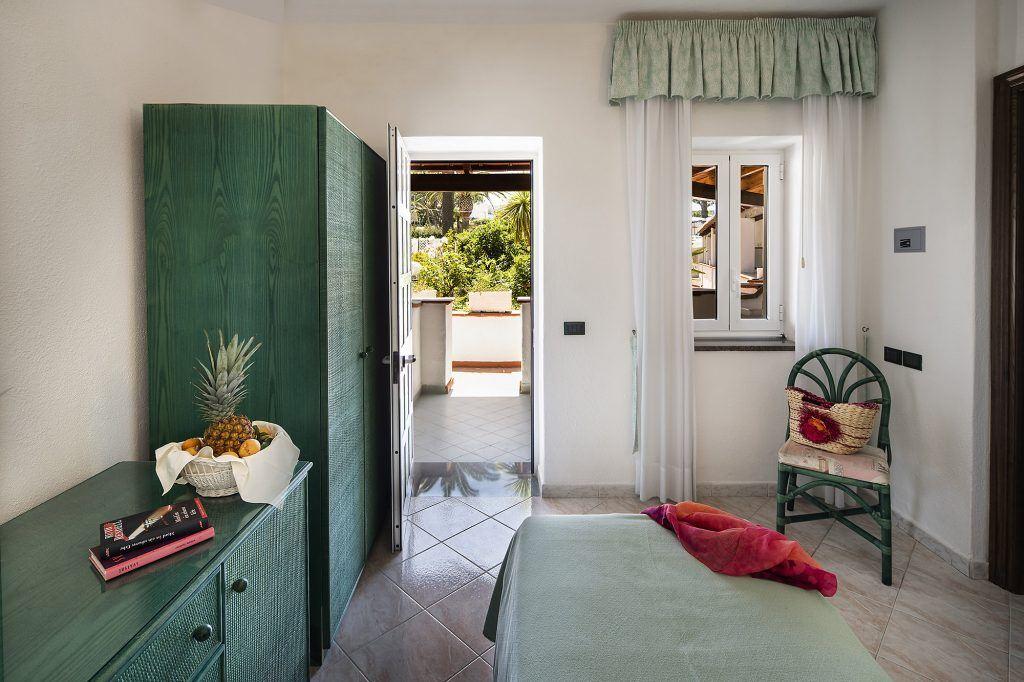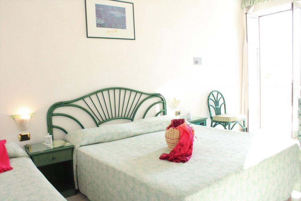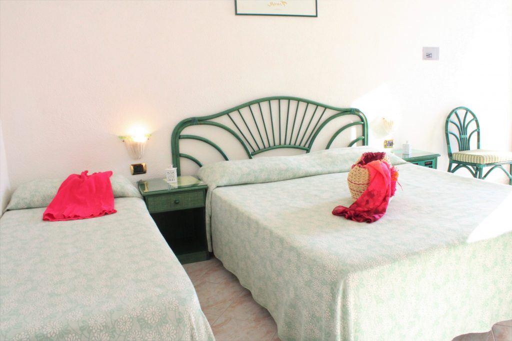 Hotel je rozdělen do několika rovnocenných budov, které se nacházejí v zahradě, kolem bazénu a samostatné budově 20 metrů od bazénu. Hosté se zde mohou ubytovat v komfortně zařízených pokojích ve středomořském stylu. Standardní výbava zahrnuje koupelnu se sprchovým koutem a bidetem, set toaletních potřeb, vysoušeč vlasů, plochou TV s plochou obrazovkou, telefon, klimatizaci (v období od 15.6. do 15.9.), trezor (za klíč se účtuje vrátná záloha) a internetové připojení Wi-Fi. Na vyžádání lze do pokoje za příplatek přistavit malou ledničku. Část pokojů nabízí výhled na moře, část na okolní krajinu, část k silnici a část do vnitřního nádvoří. Některé pokoje disponují soukromým nebo společným balkonem nebo terasou. Vyšší patra jsou dostupná pouze po schodech. Výtah je dostupný pouze v budově s recepcí.